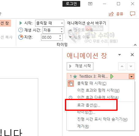 마우스 우클릭 후 효과 옵션을 선택하세요.