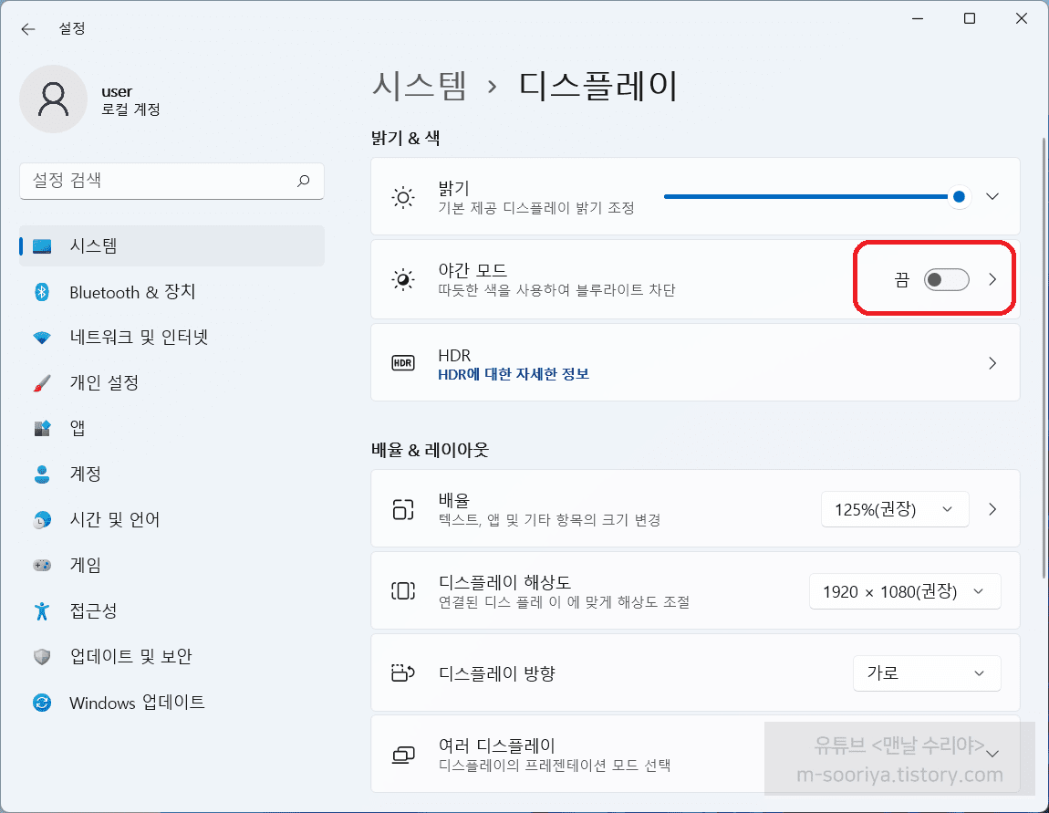 일단 여기서 [야간 모드]를 [끔] 상태로 변경하면 당장 꺼집니다.