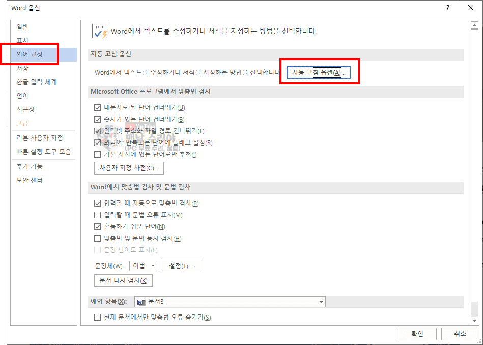 언어 교정을 위해 [자동 고침 옵션]을 누르세요.