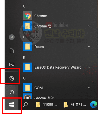 시작 버튼을 클릭한 후, 위쪽에 있는 톱니바퀴 모양의 설정을 클릭하세요.
