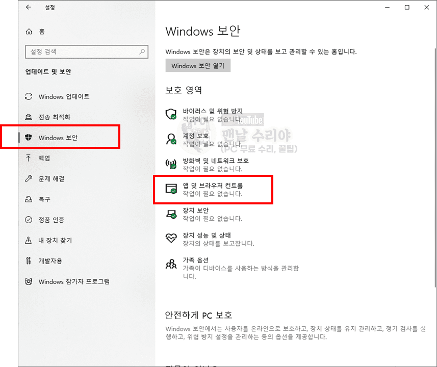 3. **Windows 보안**을 선택합니다.