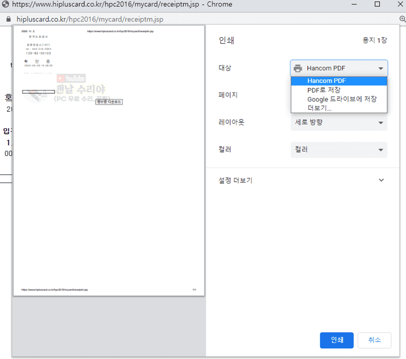 아래와 같은 인쇄창이 나타날 것입니다.