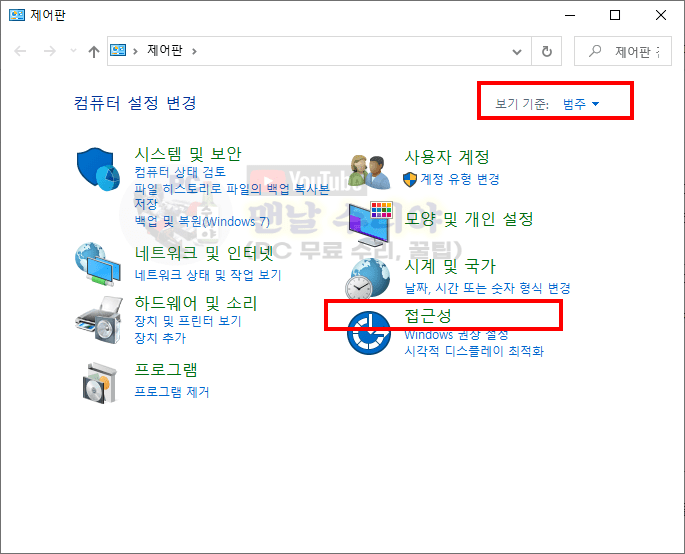 제어판 창이 나타나면 우측 상단에 있는 ‘보기 기준: 범주’를 클릭하세요. 그런 다음, 아래 아이콘 중에서 ‘접근성’을 선택하세요.